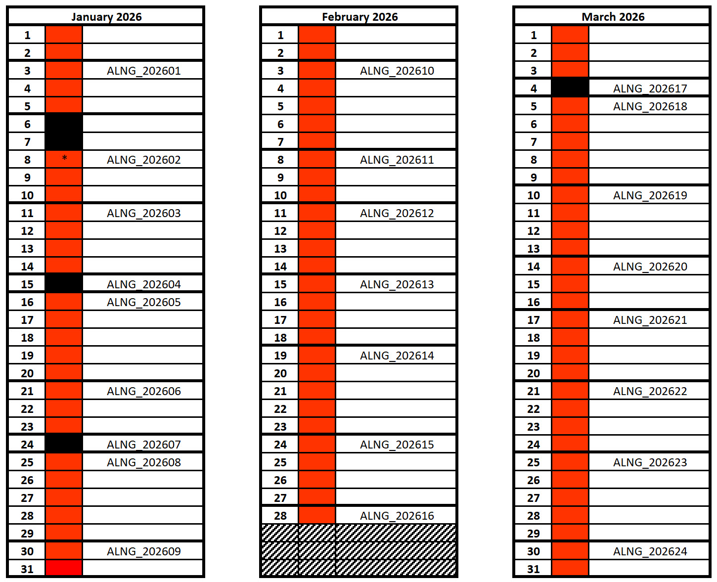 The calendar below displays, grouped by quarter, the unloading slots allocated and available for subscription in the year 2026, pursuant to Article 3, Chapter II of the Regasification Code.