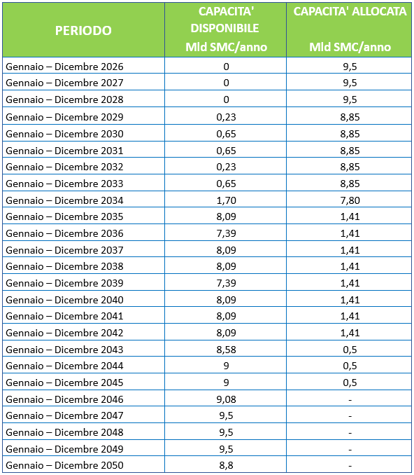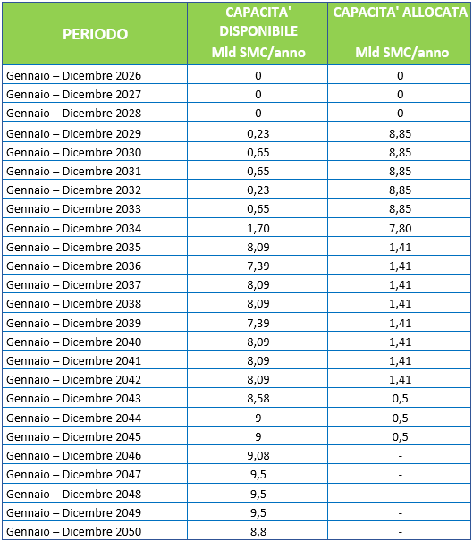 ___________________________________ 31/03/2025 In attesa del lancio della Open Season 2025 si propone di seguito la Capacità Disponibile a partire dal gennaio 2029 considerate le attuali condizioni operative e le informazioni a disposizione.